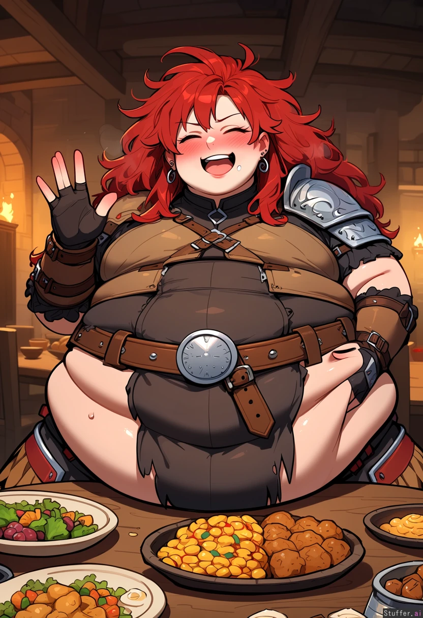 boisterous barbarian woman eating feast. sitting at round table in the local tavern. very tall, long messy red hair, fingerless gloves. solid tattered kilt with large belt with round belt buckle and sporran. leather clothes and straps. armor on shoulders. multiple earrings. overweight, heavyset, soft. (big soft belly:1.4), gained weight, very fat. friendly. flushed face, tipsy. waving hello while patting her fat belly. table full of medieval foods