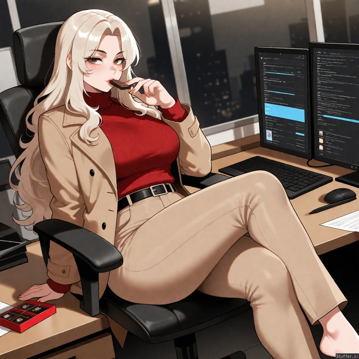 Masterpiece, best_quality, beautiful, vibrant colors, dim light, (1girl), alone, nyantcha(artist), long hair, platinum blonde hair, hazel eyes, long brown coat, red sweater, white chico pants, black belt, detectives office, sitting in office chair, feet on table, eating chocolate, (overweight:0.5)