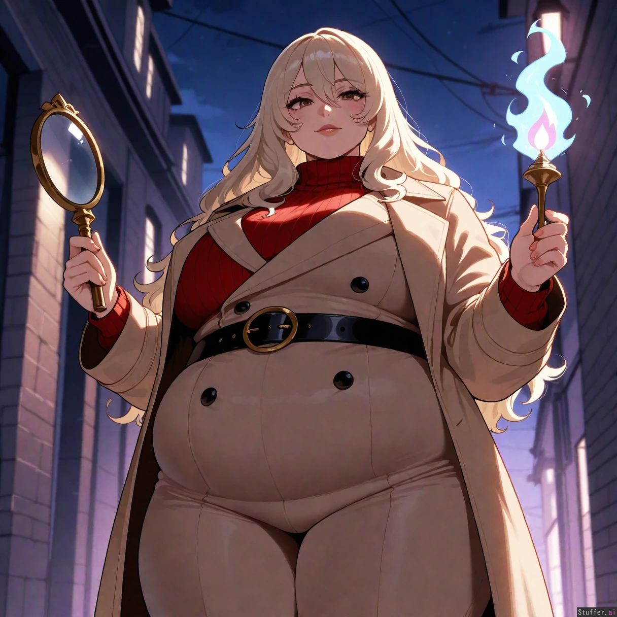 Masterpiece, best_quality, beautiful, vibrant colors, dim light, (1girl), alone, nyantcha(artist), long hair, platinum blonde hair, hazel eyes, long brown coat, red sweater, white_chico_pants, black belt, holding magifying glass, alleyway, night, (overweight:1.5)