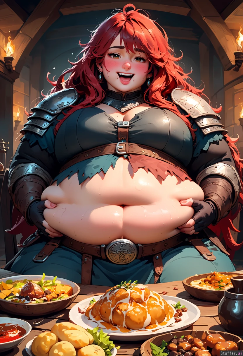 realistic boisterous barbarian woman eating feast. sitting at round table in the local tavern. beautiful face, very tall, long messy red hair, fingerless gloves. solid tattered kilt with large belt with round belt buckle and sporran. leather clothes and straps. armor on shoulders. multiple earrings. overweight, heavyset, soft. big chest. (big soft belly:1.4), gained weight, very fat. big belly squeezes against belt, belly overhang, fat rolls. friendly. flushed face, tipsy. waving hello while rubbing her fat belly. table full of medieval foods