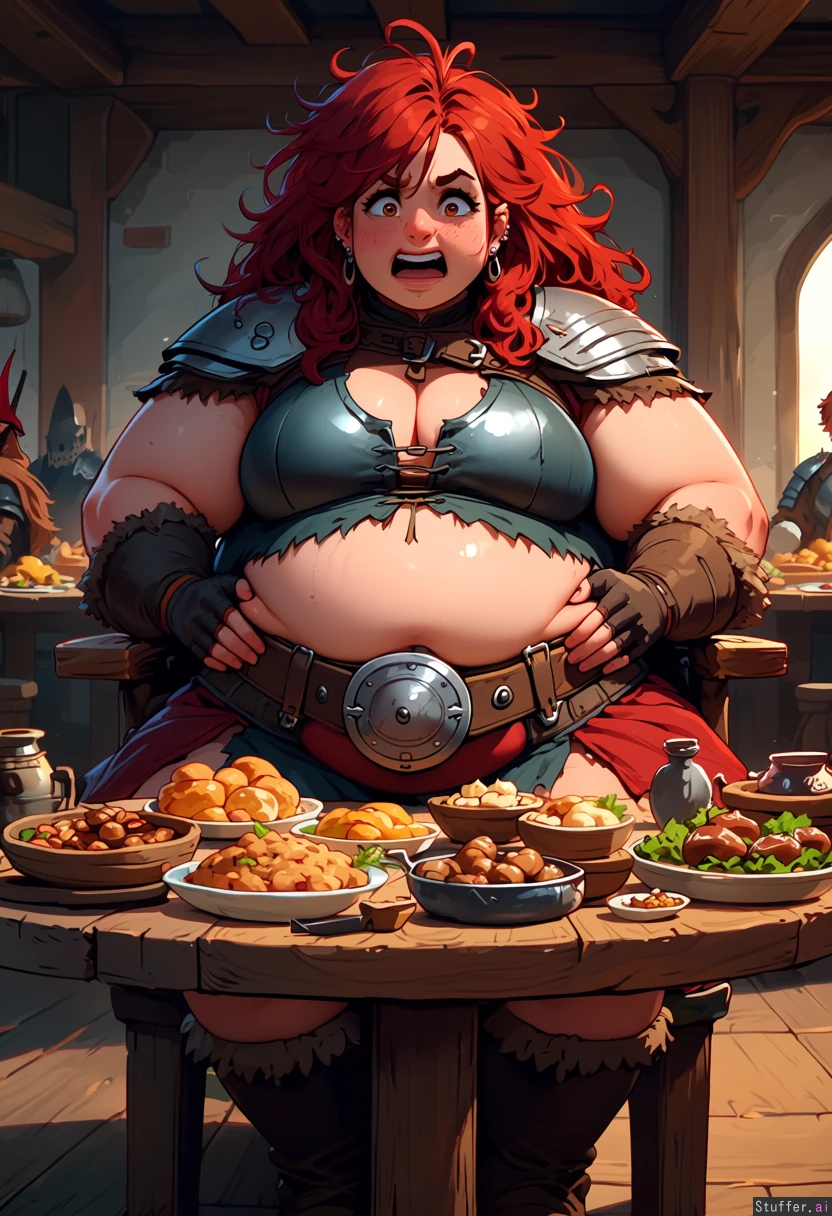 boisterous barbarian woman is grateful and in awe of feast in front of her. sitting at round table in the local tavern. beautiful face, very tall, long messy red hair, fingerless gloves. solid tattered kilt with large belt with round belt buckle and sporran. leather clothes and straps. armor on shoulders. multiple earrings. overweight, heavyset, soft. big chest. (big soft belly:1.4), gained weight, very fat. big belly squeezes against belt, belly overhang, fat rolls. affable. table full of medieval foods