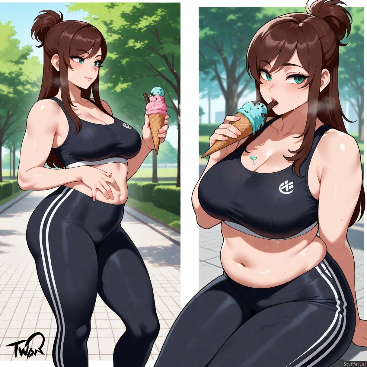 Masterpiece, best_quality, beautiful, vibrant colors, dim light, (1girl), alone, nyantcha(artist), Ema Skye, teal eyes, black sports bra, black running tights, eating chocolate ice cream cone, park, out of breath, sweating, panting, (overweight:1.3)