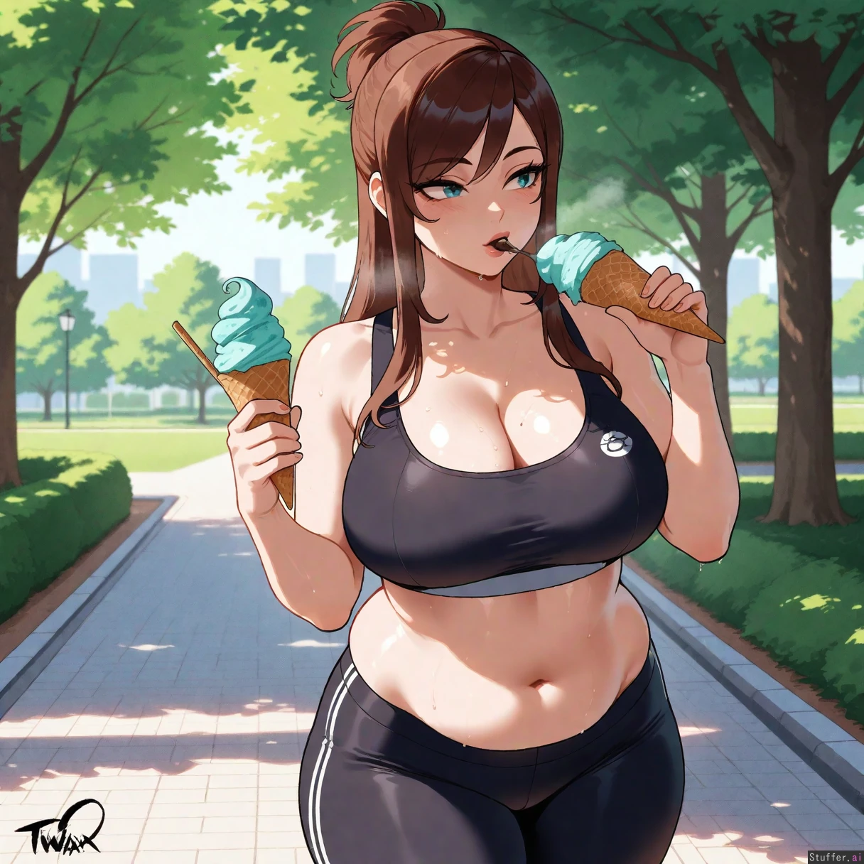 Masterpiece, best_quality, beautiful, vibrant colors, dim light, (1girl), alone, nyantcha(artist), Ema Skye, teal eyes, black sports bra, black running tights, eating chocolate ice cream cone, park, out of breath, sweating, panting, park, (overweight:1.3)