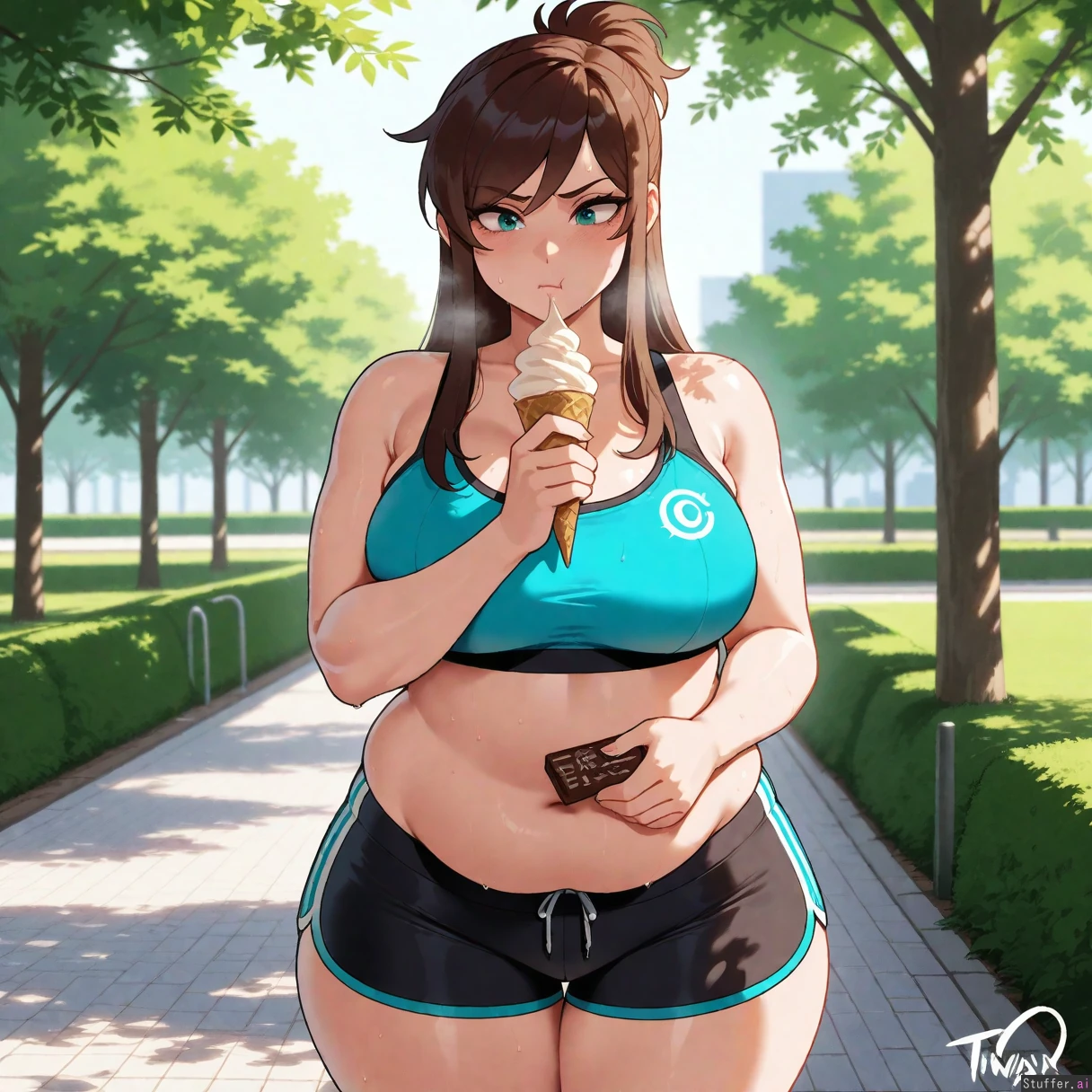 Masterpiece, best_quality, beautiful, vibrant colors, dim light, (1girl), alone, nyantcha(artist), Ema Skye, teal eyes, tight black sports bra, tight black running shorts, wide hips, eating chocolate ice cream cone, park, out of breath, annoyed, pouting, sweating, panting, park, (overweight:1.5)