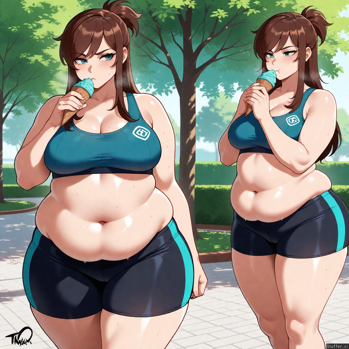 Masterpiece, best_quality, beautiful, vibrant colors, dim light, (1girl), alone, nyantcha(artist), Ema Skye, teal eyes, tight black sports bra, tight black running shorts, wide hips, eating chocolate ice cream cone, park, out of breath, annoyed, pouting, sweating, panting, park, fat belly, (overweight:1.5)