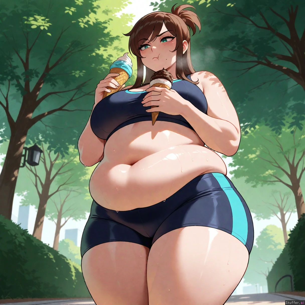 Masterpiece, best_quality, beautiful, vibrant colors, dim light, (1girl), alone, nyantcha(artist), Ema Skye, teal eyes, tight black sports bra, tight black running shorts, wide hips, eating chocolate ice cream cone, park, out of breath, annoyed, pouting, sweating, panting, park, fat belly, low angle, (overweight:1.5)
