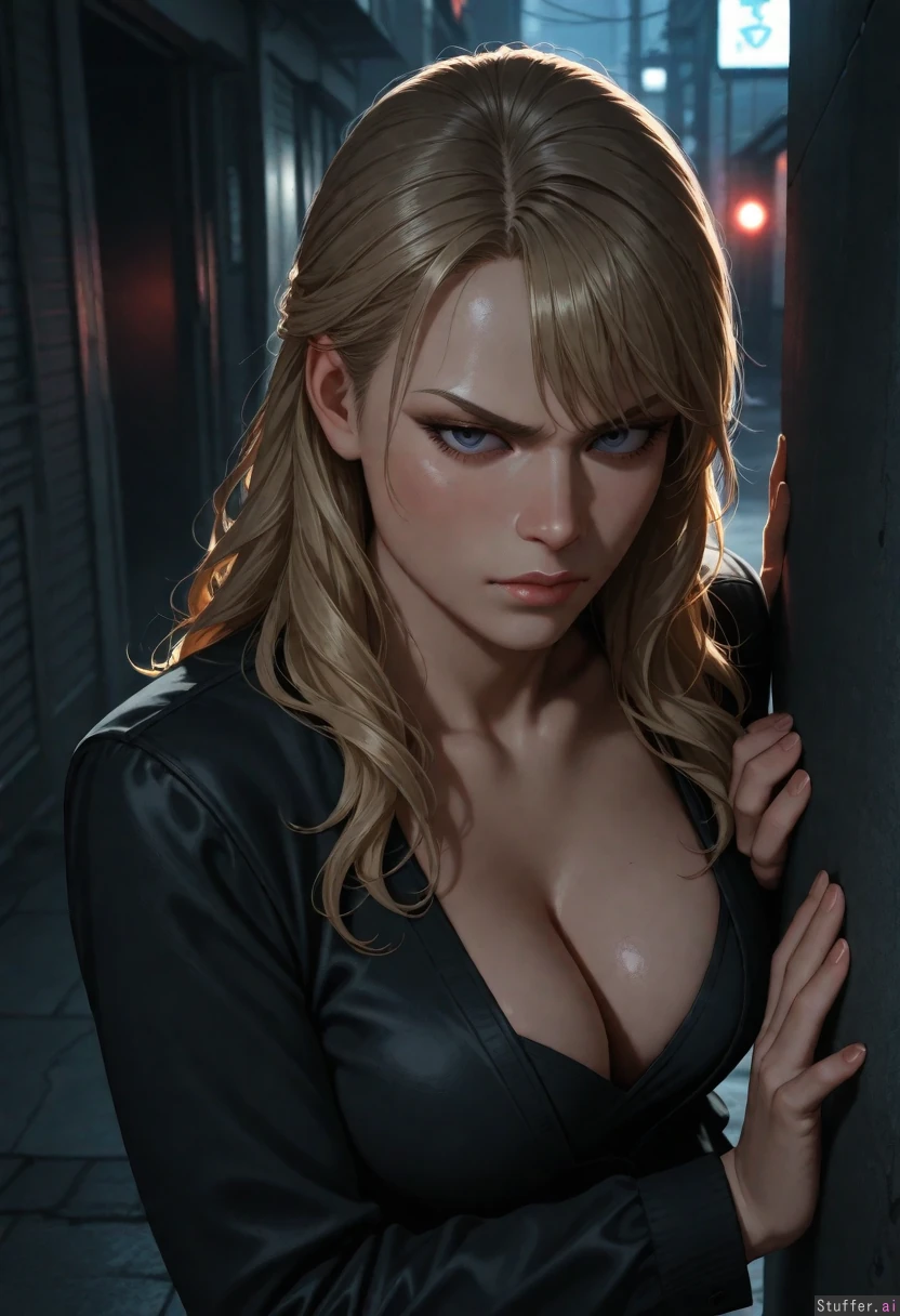 angry_furious, 20yo Hero(maled) defeats and chokes 35yo Evil_Villainess(female), ((cleavage)), (against the wall), (dark city alley) ((cinematic lighting)), ((absurdres)), ((ultra high definition)), ((perfect)), ((realistic lighting))