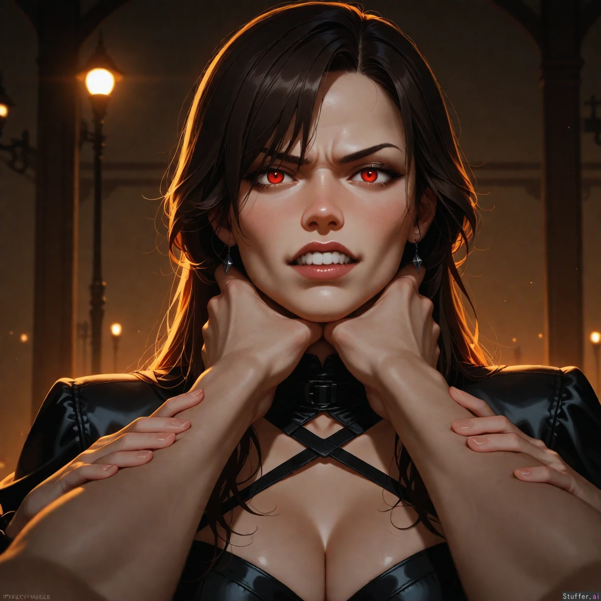((cinematic lighting)), ((absurdres)), ((ultra high definition)), ((perfect)), ((realistic lighting)), ((evil_villainess getting choked)), angry face choking, hands around neck, cleavage