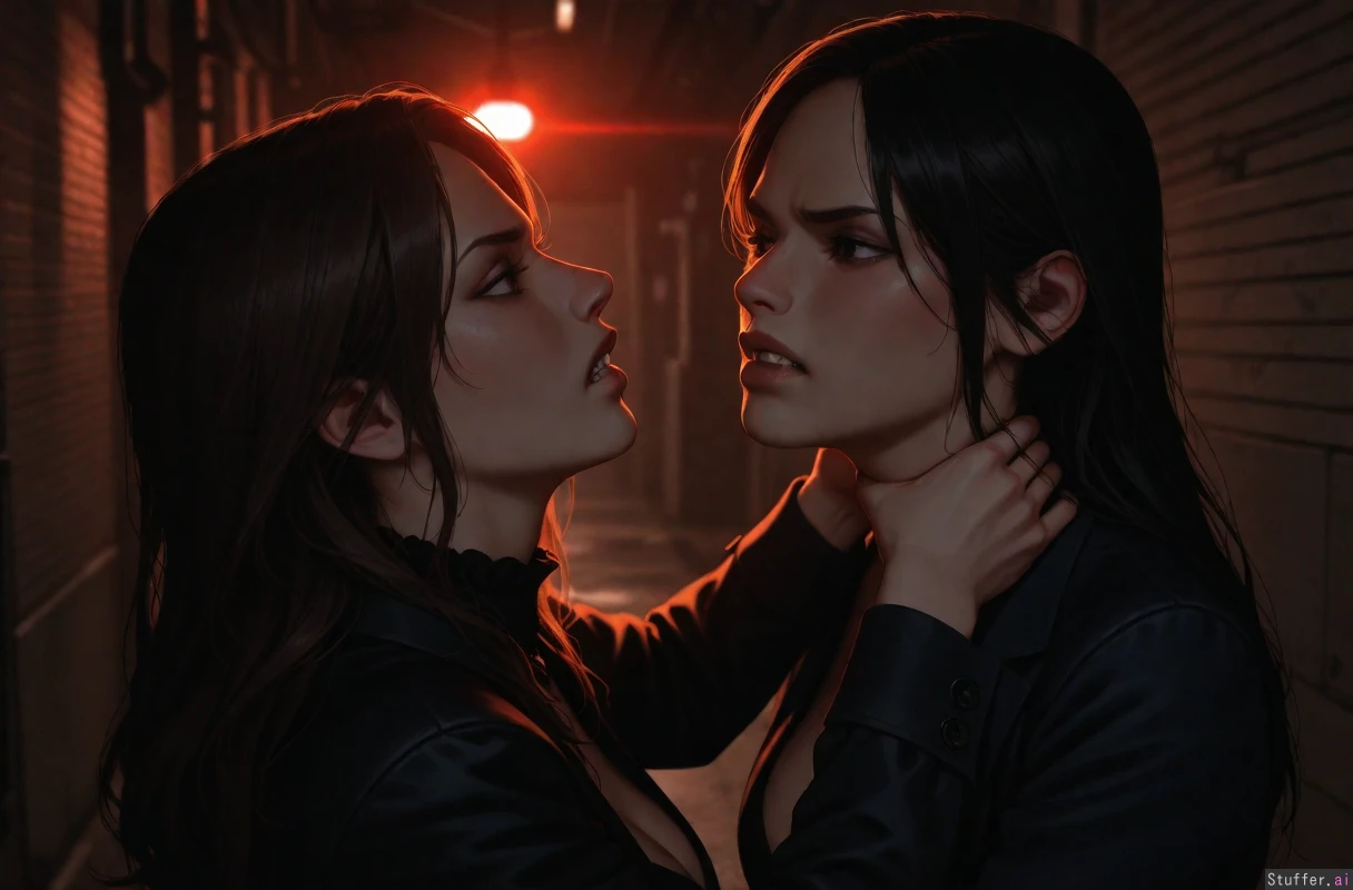 ((cinematic lighting)), ((absurdres)), ((ultra high definition)), ((perfect)), ((realistic lighting)), ((evil_villainess getting choked hard)), angry face choking squeeze, hands around neck, cleavage, wide shot, side_view, empty dark alley