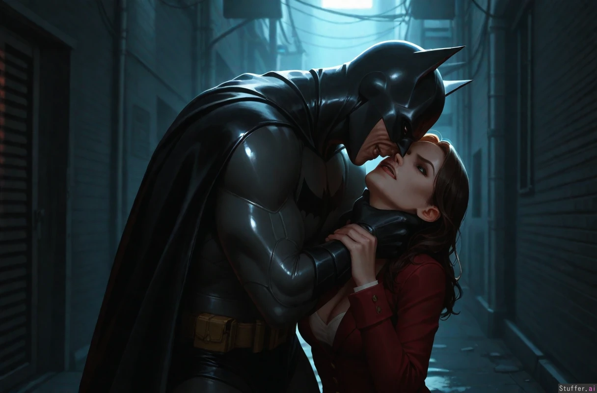 ((cinematic lighting)), ((absurdres)), ((ultra high definition)), ((perfect)), ((realistic lighting)), ((evil_villainess getting choked hard by batman)), angry face choking squeeze, hands around neck, cleavage, wide shot, side_view, empty dark alley