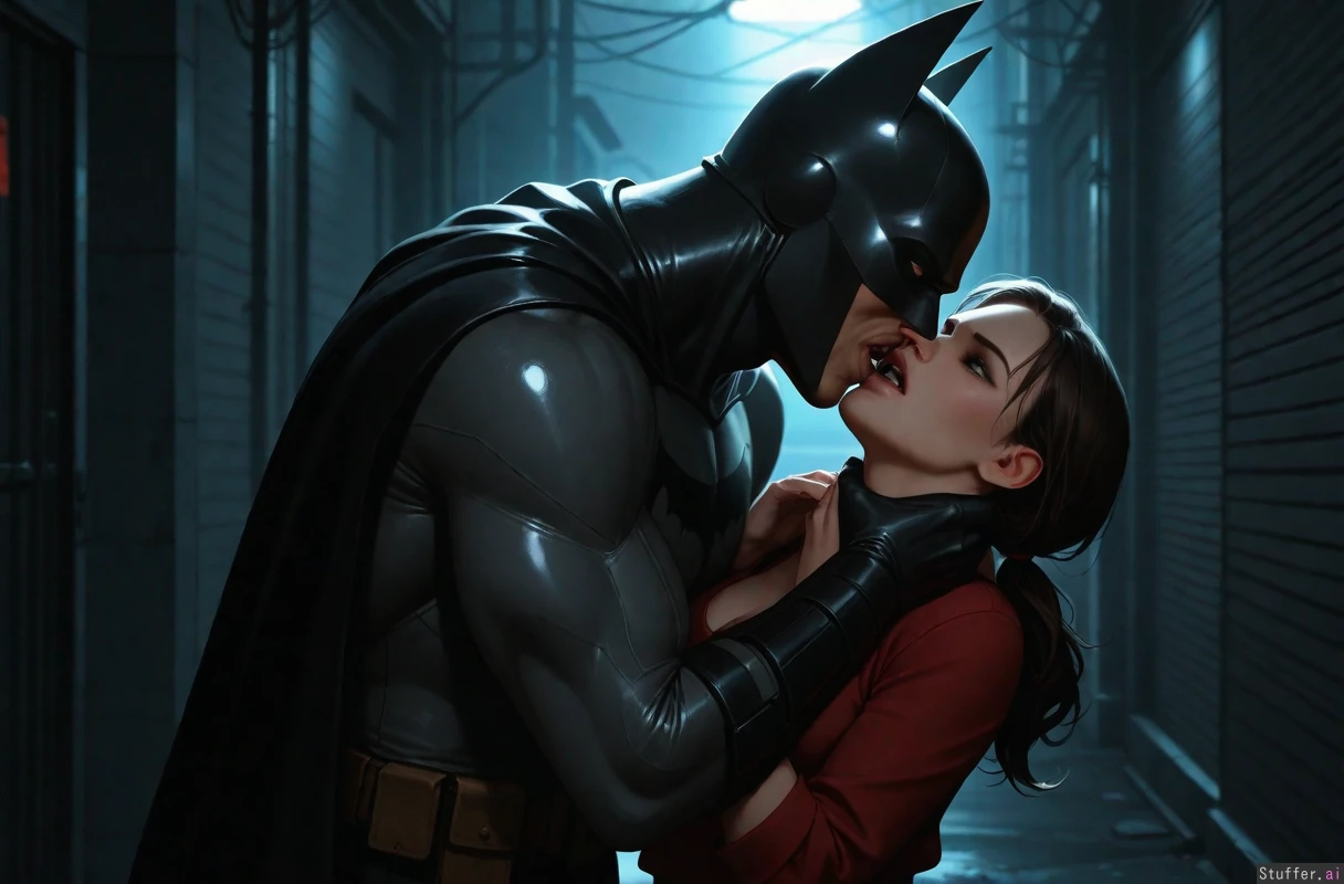 ((cinematic lighting)), ((absurdres)), ((ultra high definition)), ((perfect)), ((realistic lighting)), (Lori Quaid (Total Recall 1990) getting choked hard by batman)), angry face choking squeeze, hands around neck, cleavage, wide shot, side_view, empty dark alley
