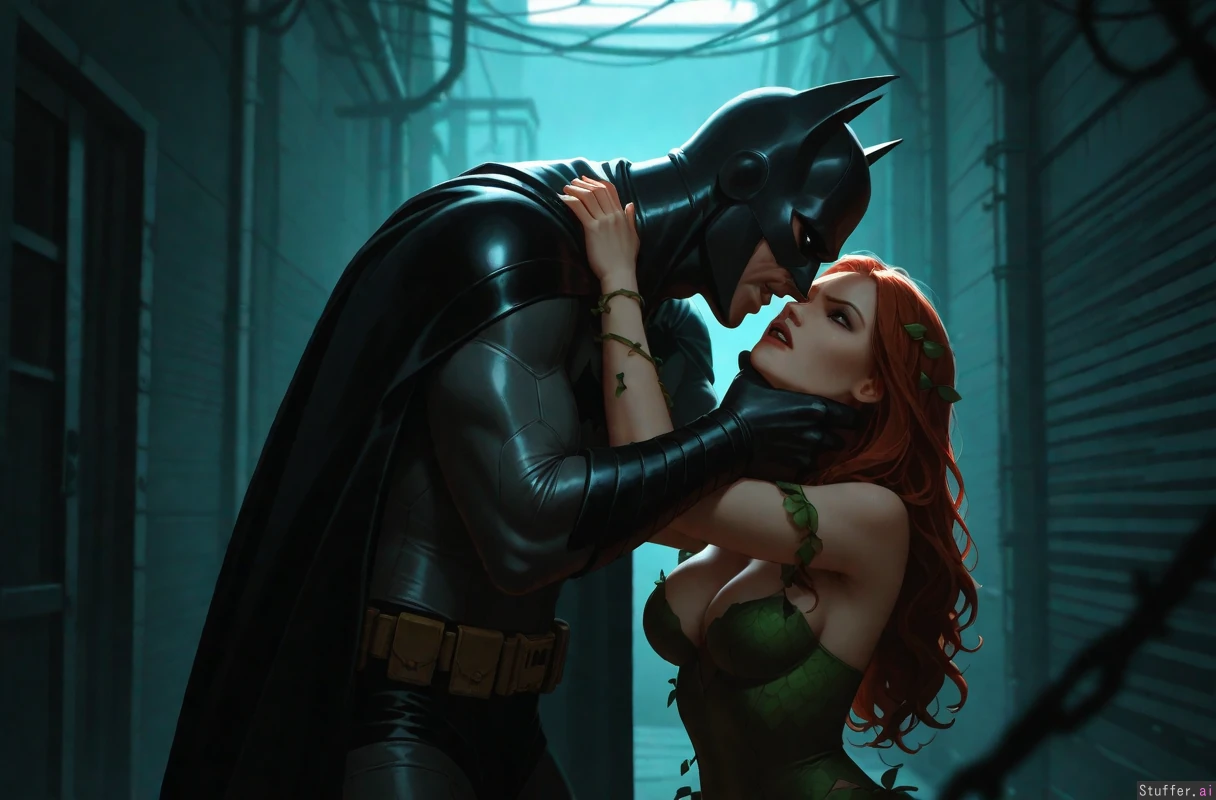 ((cinematic lighting)), ((absurdres)), ((ultra high definition)), ((perfect)), ((realistic lighting)), ((Poison_Ivy getting choked hard by batman)), angry face choking squeeze, hands around neck, cleavage, wide shot, side_view, empty dark alley