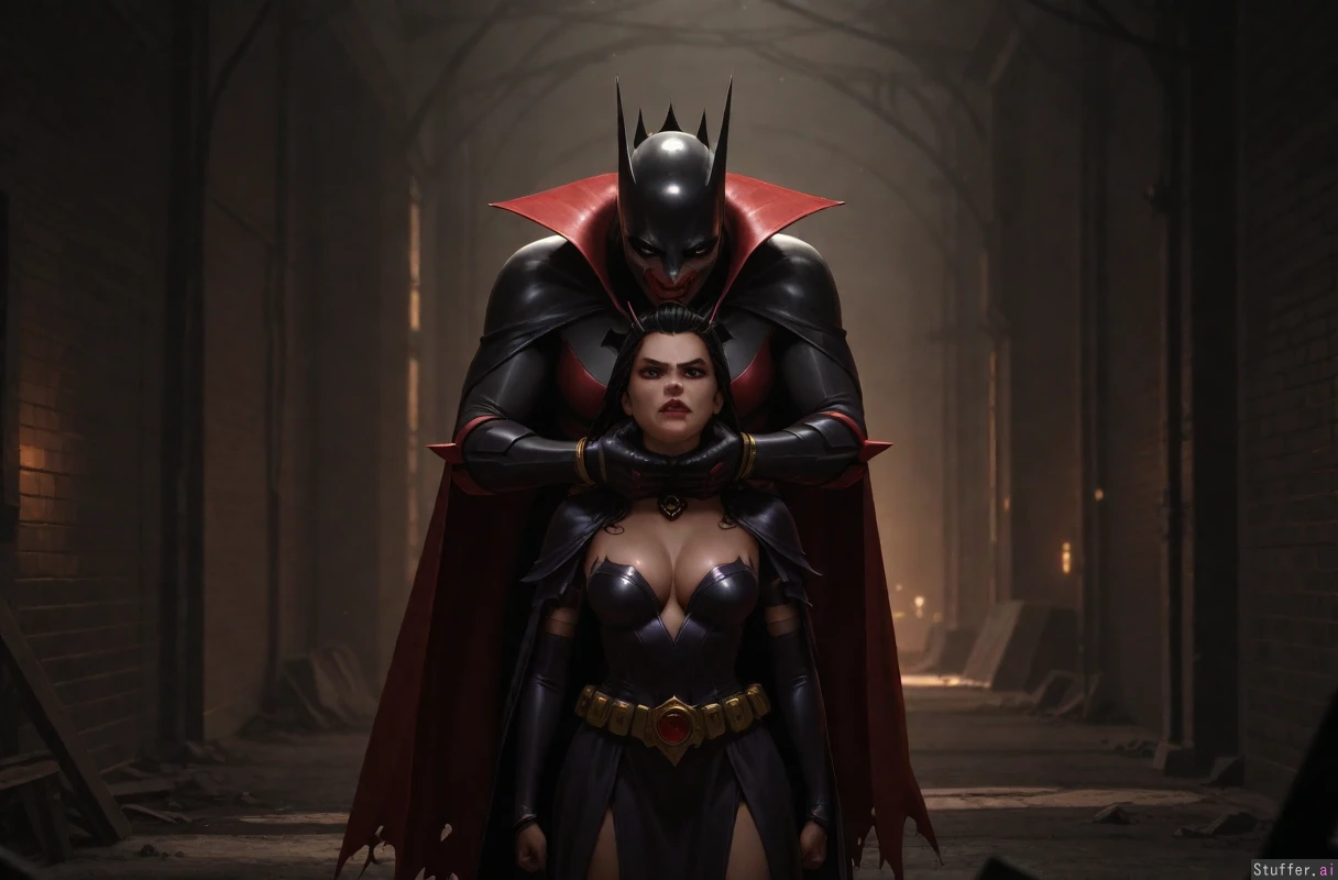 ((cinematic lighting)), ((absurdres)), ((ultra high definition)), ((perfect)), ((realistic lighting)), ((Dark Queen (Battletoads) getting choked hard by batman)), angry face choking squeeze, hands around neck, cleavage, wide shot, side_view, empty dark alley