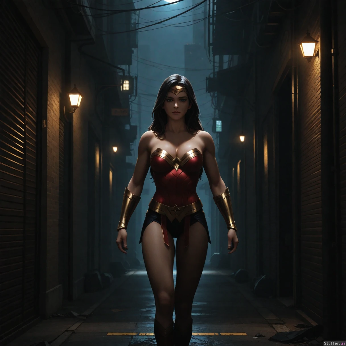 ((cinematic lighting)), ((absurdres)), ((ultra high definition)), ((perfect)), ((realistic lighting)), batman fucks wonder woman deep cleavage, wide shot, side_view, empty dark alley