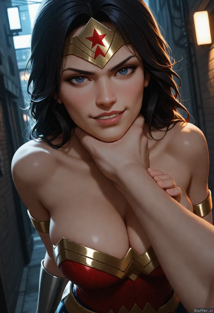 wide angle, angry smirk, ((wonder_woman choked_by_viewer:1.6)), ((deep cleavage)), dark city alley, ((cinematic lighting)), ((absurdres)), ((ultra high definition)), ((perfect)), ((realistic lighting))