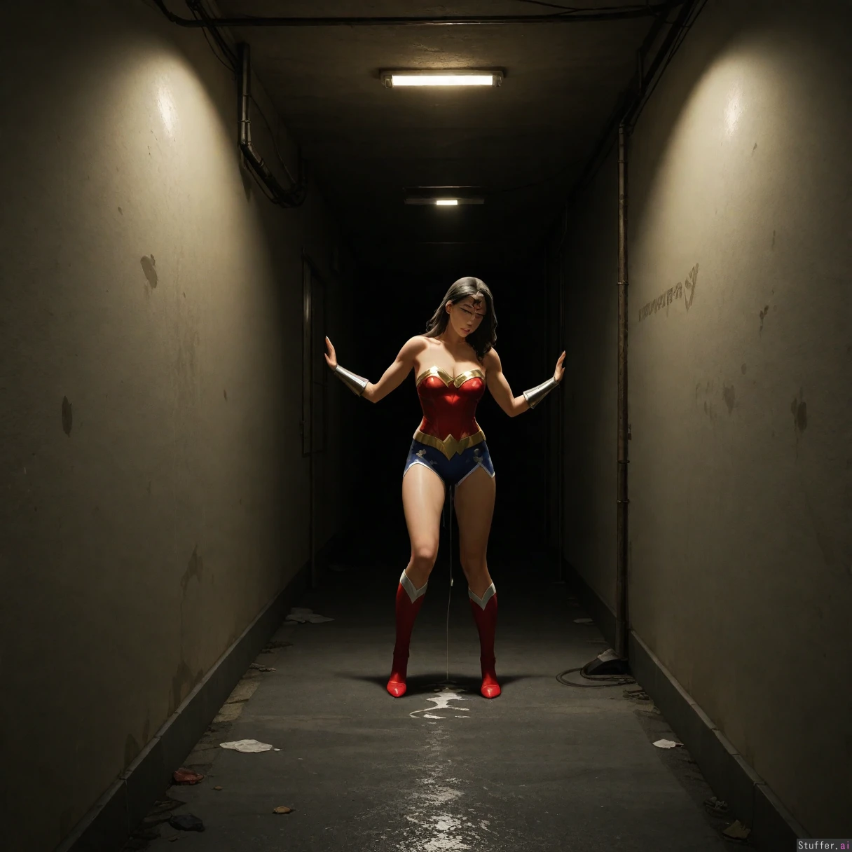 cinematic lighting, absurdres, ultra high definition, realistic lighting, wonder_woman getting fucked against the wall, cum splash, deep cleavage, wide shot, side_view, empty dark alley