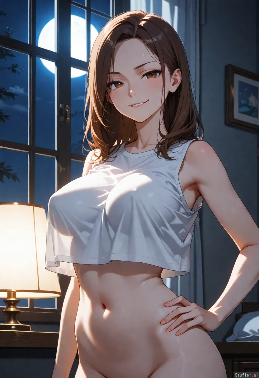 (( solo, adult,)) (( White_shirt, cropped_shirt, shirt_overhang, sleeveless_shirt, bottomless, naked hips)) Damp skin, (( Slim_body)) (( slim_waist)) (( Bedroom, Moonlight, night, moon, window,, looking at viewer, hand_on_hip,smirk)) medium_breasts perky_breasts big_belly fat_belly bottomheavy
