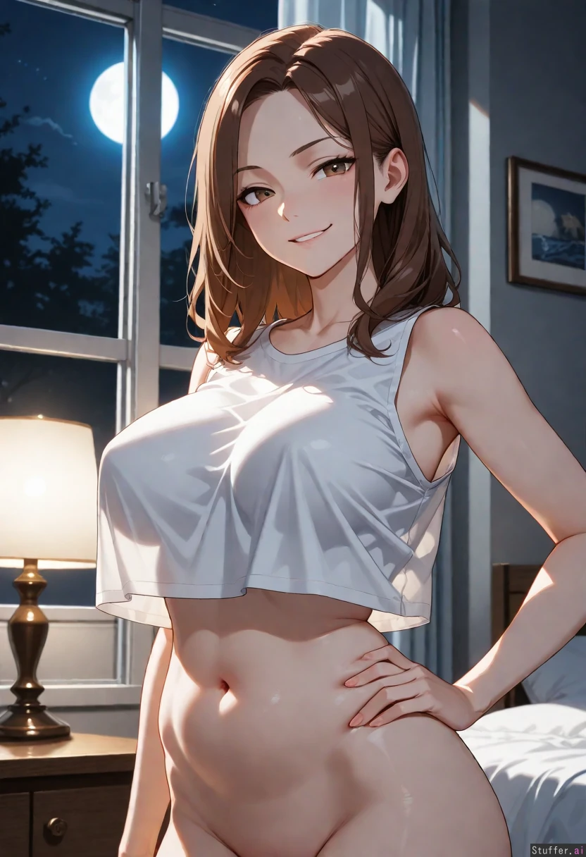 (( solo, adult,)) (( White_shirt, cropped_shirt, shirt_overhang, sleeveless_shirt, bottomless, naked hips)) Damp skin, (( Slim_body)) (( Bedroom, Moonlight, night, moon, window,, looking at viewer, hand_on_hip,smirk)) medium_breasts perky_breasts big_belly fat_belly bottomheavy