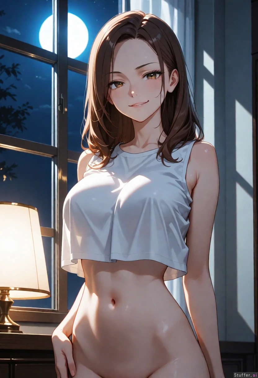 (( solo, adult,)) (( White_shirt, cropped_shirt, shirt_overhang, sleeveless_shirt, bottomless, naked hips)) Damp skin, (( Slim_body)) (( slim_waist)) (( Bedroom, Moonlight, night, moon, window,, looking at viewer, hand_on_hip,smirk))