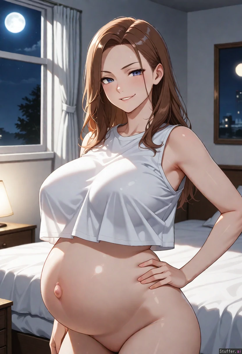 (( solo, adult,)) (( White_shirt, cropped_shirt, shirt_overhang, sleeveless_shirt, bottomless, naked hips)) Damp skin, (( Bedroom, Moonlight, night, moon, window,, looking at viewer, hand_on_hip,smirk)) pregnant weight_gain