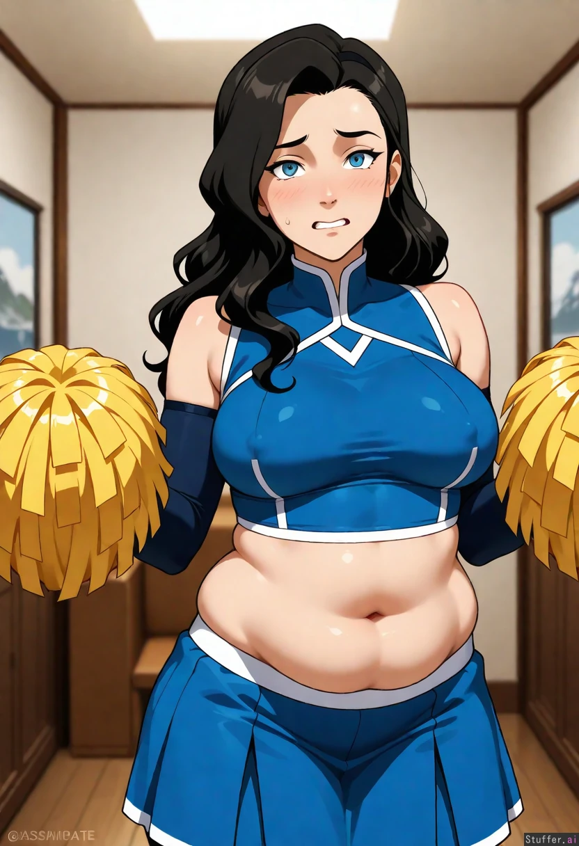 (Asami sato from the legend of korra), 1girl, cheerleader chubby_belly detailed worried big_belly scared tight_clothing