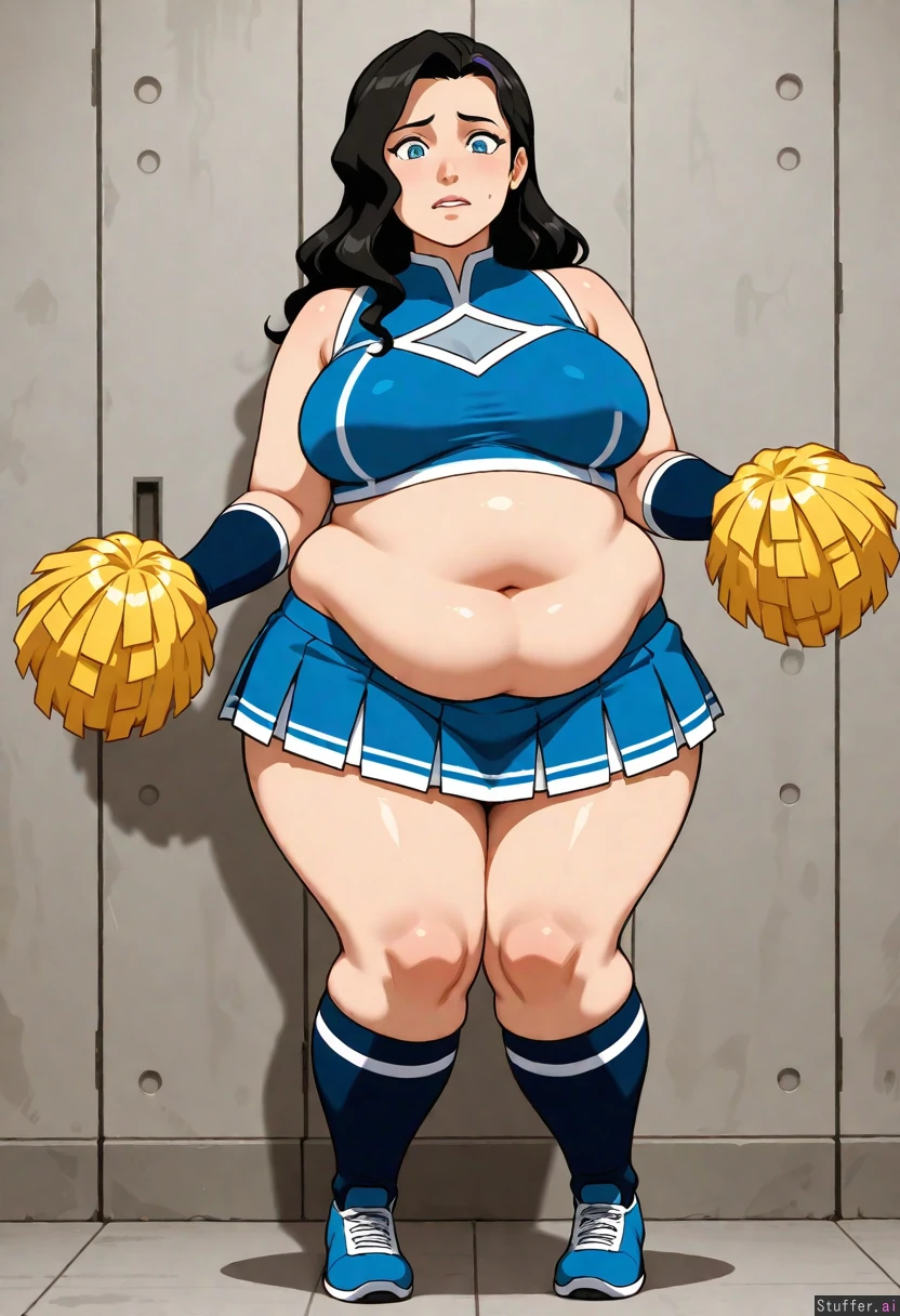 (Asami sato from the legend of korra), 1girl, cheerleader chubby_belly detailed worried big_belly scared obese_female ripped_clothing