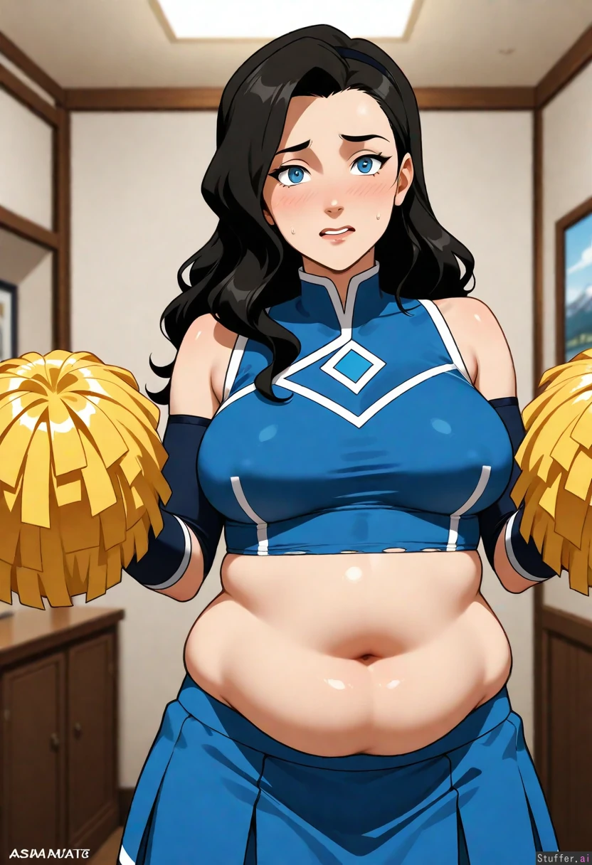 (Asami sato from the legend of korra), 1girl, cheerleader chubby_belly detailed worried big_belly scared ripped_clothing fat_belly