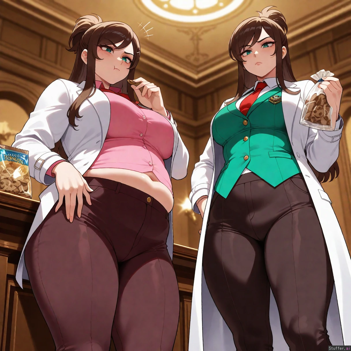 Masterpiece, best_quality, beautiful, vibrant colors, dim light, (1girl), alone, nyantcha(artist), Ema Skye, pink shirt, green vest with gold buttons, brown capri pants, red tie, white coat, teal eyes, low angle, pouting, annoyed, eating chocolate chip, holding chips bag, courtroom, midriff, pink panties, unbuttoned pants, (overweight:1.5)