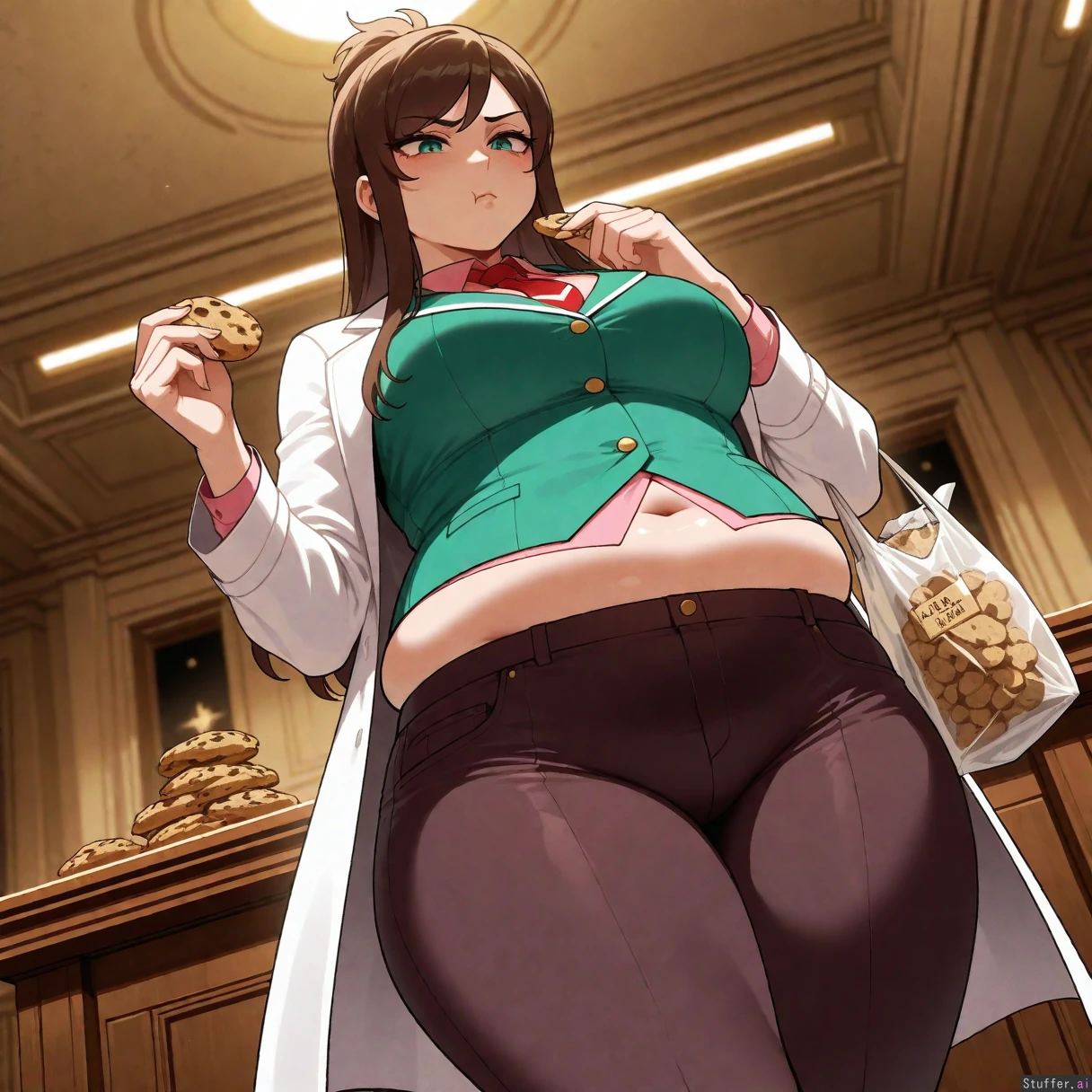Masterpiece, best_quality, beautiful, vibrant colors, dim light, (1girl), alone, nyantcha(artist), Ema Skye, pink shirt, green vest with gold buttons, brown capri pants, red tie, white coat, teal eyes, low angle, pouting, annoyed, eating chocolate chip, holding chips bag, courtroom, midriff, pink panties, unbuttoned pants, (overweight:1.6)