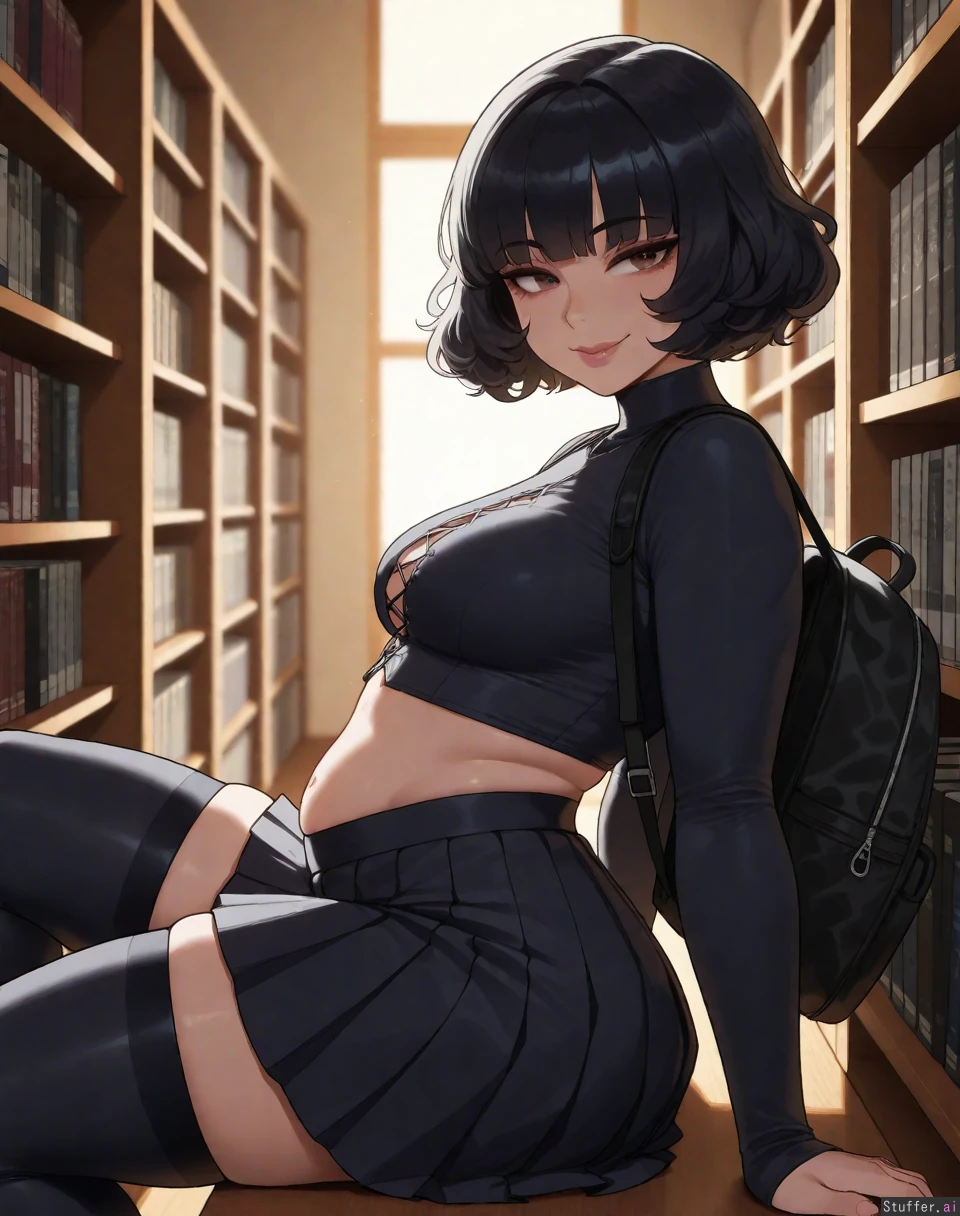 ((Solo, 1 woman)), ((nyantcha)))), (krekkov), c.cu(artist), araneesama(artist), 8k, high resolution, maximum pixel density, masterpiece, (((highly detailed))), ((flawless)), (((high rating))), ((highly detailed face)), saturated colors, 8k, high resolution, best quality, ((((((textless_version)))))), (((((20 year old goth bbw))))), ((((wavy hair)))), ((((short black pleated skirt, cropped black shirt, black backpack, thighhighs)))), (((bob cut))), ((((black hair)))), (((((revealing_clothes))))), (((bangs))), ((((indoors)))), ((((warm lighting)))), ((((from_side)))), ((((seductive pose)))), (((looking_at_viewer))), (((((Sitting in library))))), ((((belly_squish)))), ((((nervous smile)))), (((beautiful brown eyes))), (((sensual_look))), ((huge lips)), (((aroused))), arched back, covered belly, (3/4th side view), S
