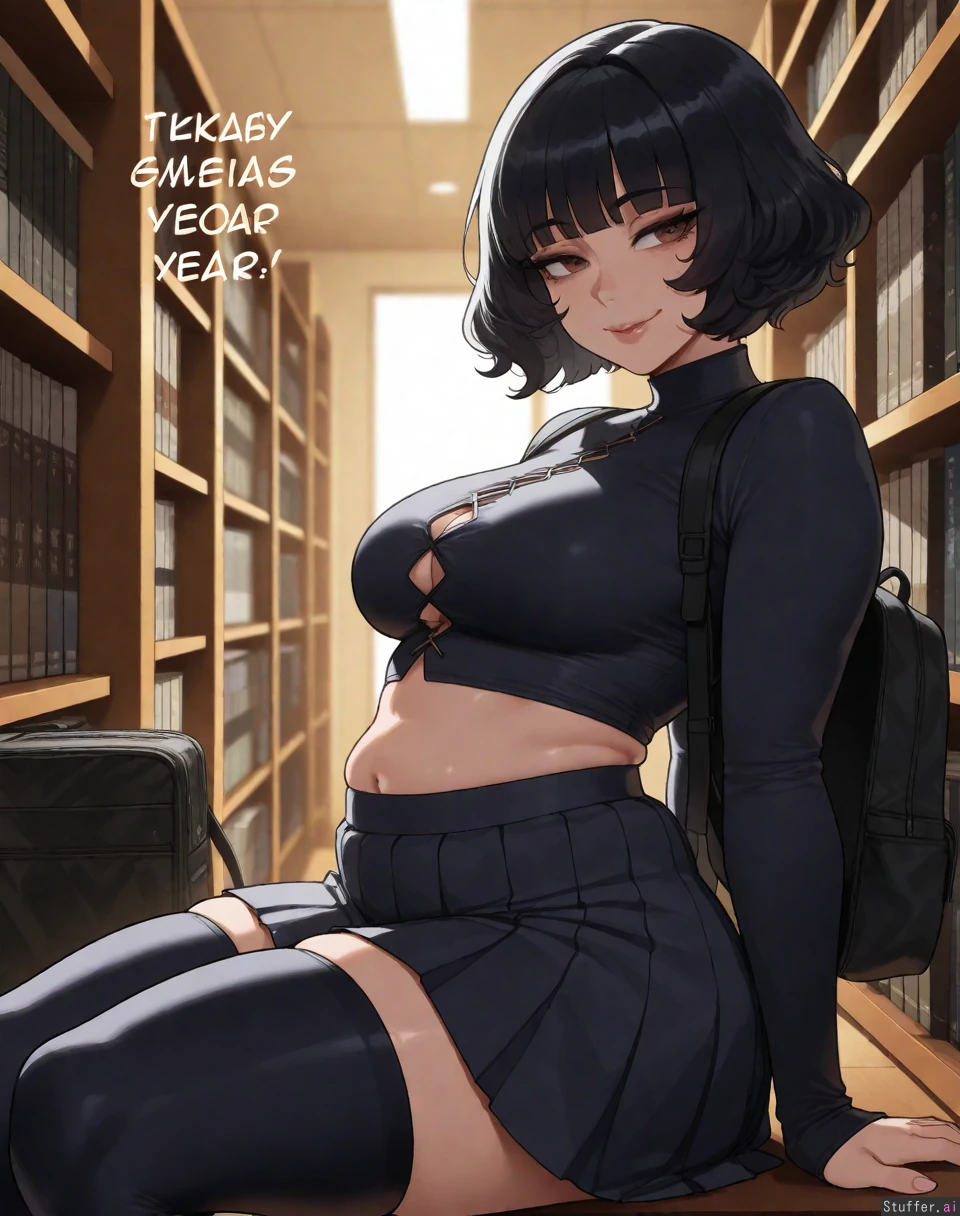 ((Solo, 1 woman)), ((nyantcha)))), (krekkov), c.cu(artist), araneesama(artist), 8k, high resolution, maximum pixel density, masterpiece, (((highly detailed))), ((flawless)), (((high rating))), ((highly detailed face)), saturated colors, 8k, high resolution, best quality, ((((((textless_version)))))), (((((20 year old goth bbw))))), ((((wavy hair)))), ((((short black pleated skirt, cropped black shirt, black backpack, thighhighs)))), (((bob cut))), ((((black hair)))), (((((revealing_clothes))))), (((bangs))), ((((indoors)))), ((((warm lighting)))), ((((from_side)))), ((((seductive pose)))), (((looking_at_viewer))), (((((Sitting in library))))), ((((belly_squish)))), ((((nervous smile)))), (((beautiful brown eyes))), (((sensual_look))), ((huge lips)), (((aroused))), arched back, covered belly, (3/4th side view), ((((belly rolls)))),