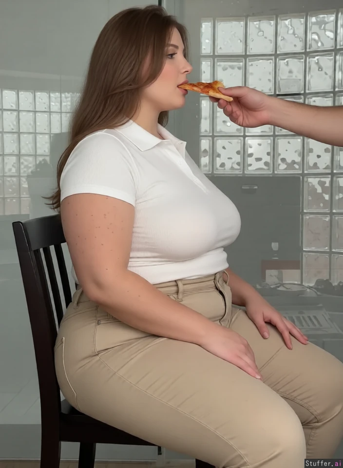 Give her top a polo collar, tuck that top into beige jeans. Soften her jawline, someones arm reaching to feed her a pizza