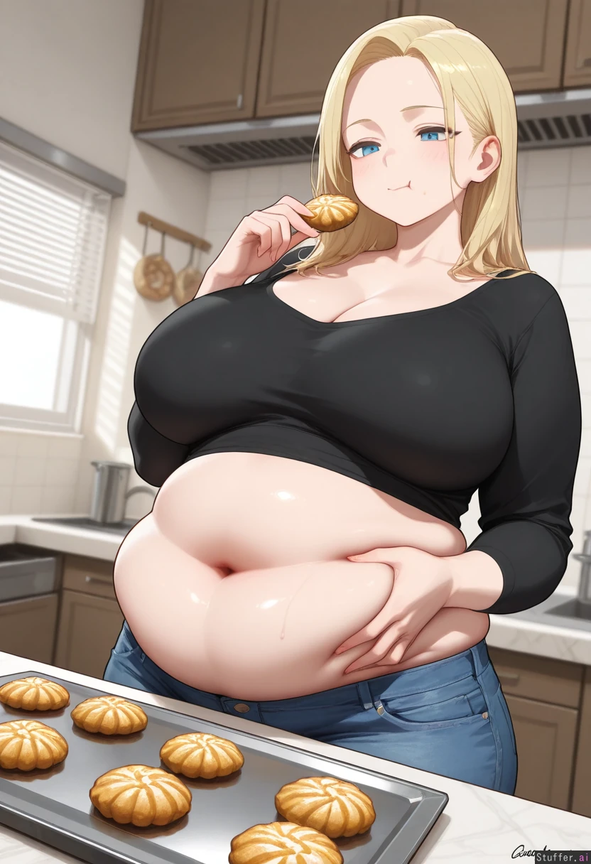 gorgeous woman, long blonde hair, jeans, tight clothes, muffin top, belly stretching clothes, large round belly, soft belly, fat belly eating pastries in the kitchen, chewing, hand on countertop. obese