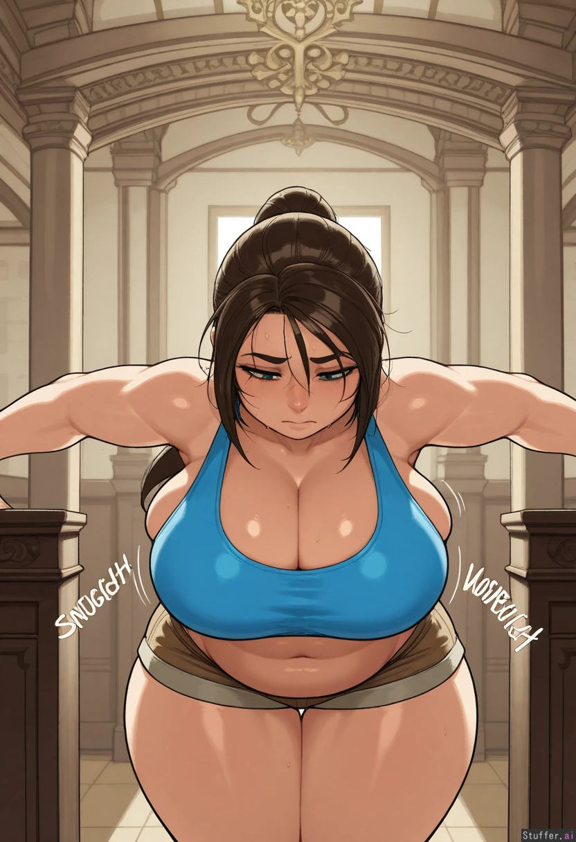Krekkov_artist, KipKipTei_artist, masterpiece, best quality, upscale, high resolution, Solo, perfect proportions, (lara croft), 1girl, solo, blue tank top, brown short shorts, stern_expression, looking_down, worried, panicing, in a temple, (Fat):1.9, wobble, jiggling, bouncing, (getting fatter, fattening, weight_gain, weightgain), bursting_breasts, bursting_ass, belly_bursting_out_of_clothes,