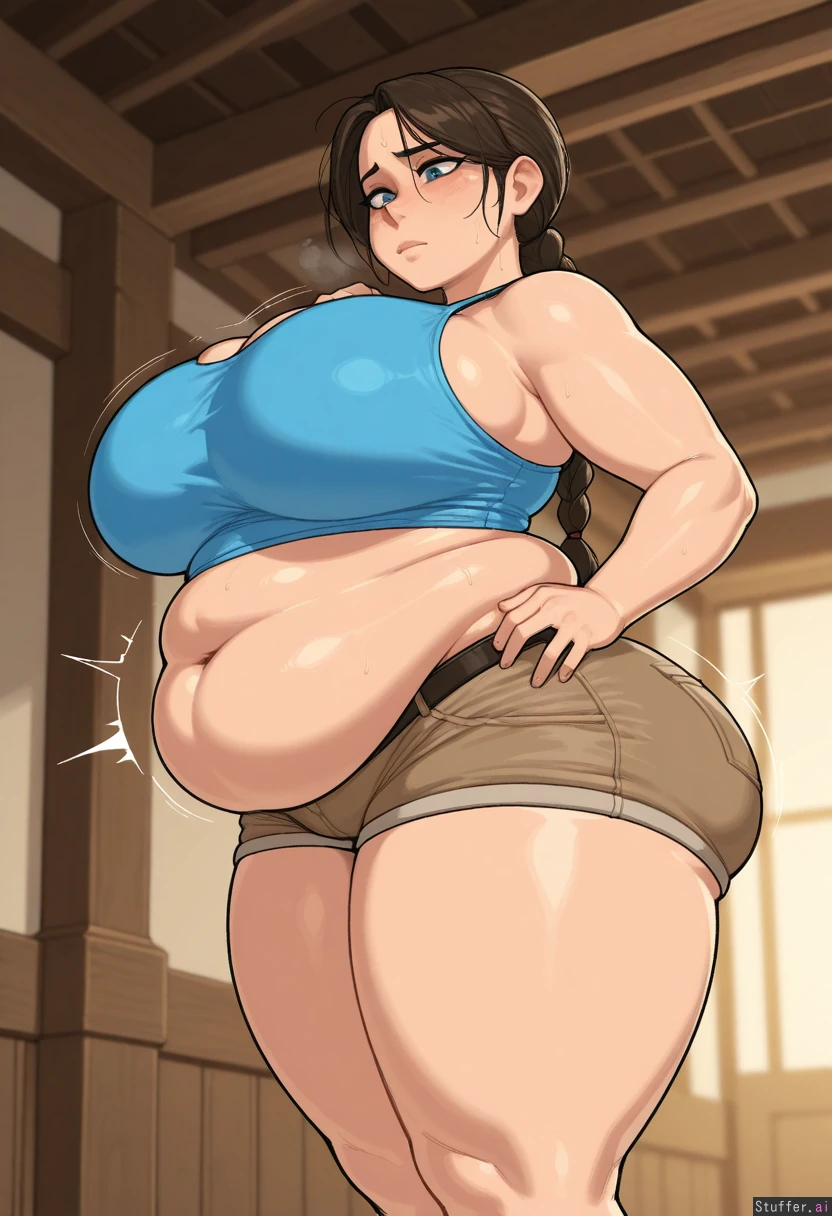 Krekkov_artist, KipKipTei_artist, masterpiece, best quality, upscale, high resolution, Solo, perfect proportions, (lara croft), 1girl, solo, blue tank top, brown short shorts, stern_expression, looking_down, worried, panicing, in a temple, (Obese):1.4, wobble, jiggling, bouncing, (getting fatter, fattening, weight_gain, weightgain), bursting_breasts, bursting_ass, belly_bursting_out_of_clothes, (big_breasts, massive_belly, big_ass),