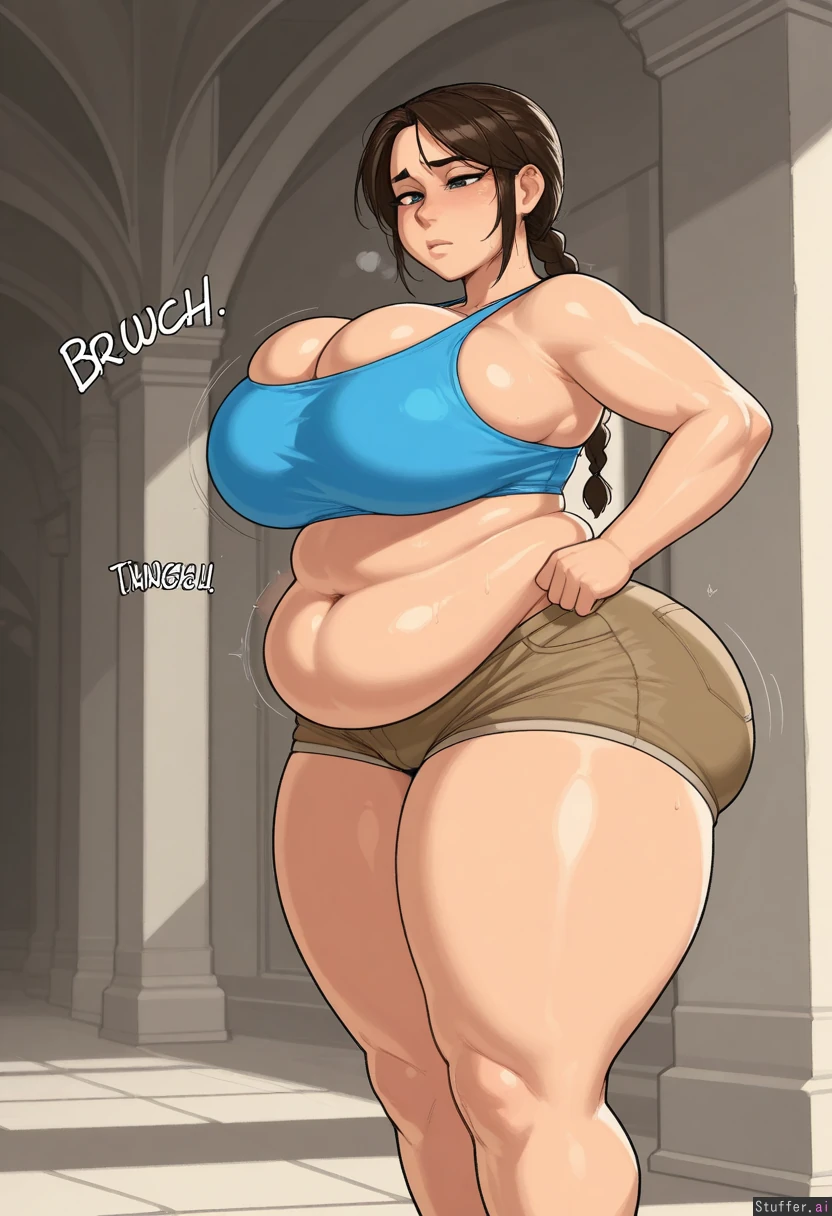 Krekkov_artist, KipKipTei_artist, masterpiece, best quality, upscale, high resolution, Solo, perfect proportions, (lara croft), 1girl, solo, blue tank top, brown short shorts, stern_expression, looking_down, worried, exhasted, in a temple, (Obese):1.5, wobble, jiggling, bouncing, (getting fatter, fattening, weight_gain, weightgain), bursting_breasts, bursting_ass, belly_bursting_out_of_clothes, (massive_breasts, massive_belly, massive_ass),