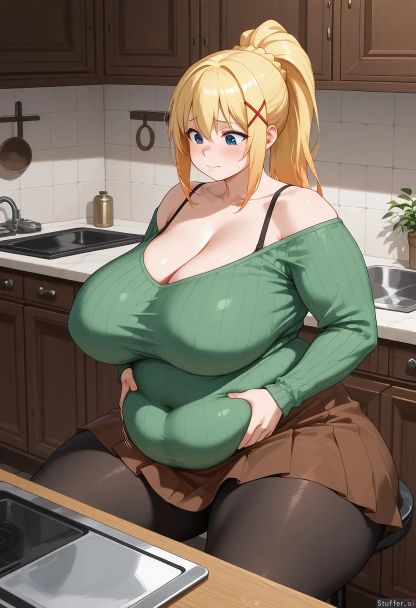 (( short)), (solo, 1girl), (Darkness_konosuba), (Covered navel, high waisted long brown leather skirt, black tights, skirt, ribbed long sleeve green sweater), tight clothes, Long blonde ponytail, straight blonde bangs, blue eyes, pale skin, short, Kitchen, sitting down, groping self, concerned, looking down, frown, struggling, (From the Side, cleavage), (((bra strap indents, belly pushing out))), (Morbidly Obese, ssbbw, soft belly, doughy belly, jiggling belly, gripping belly, love handles, weight gain, plump, fat arms, belly rolls, covered belly, mature, sagging breasts), (Round fat face, chubby cheeks, fat arms), Gigantic breasts, plump breasts, wide spread breasts, gigantic hips, wide hips, hips_wider_than_shoulders, gigantic ass, gigantic butt, gigantic thighs, thicc thighs, bloated, ((((outgrown clothes))))