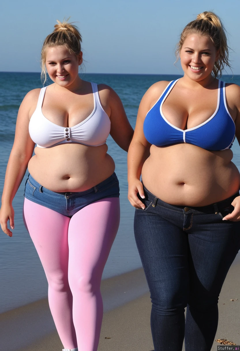 2 tall girls, huge fatty midsection, huge boobs, crop top, unbuttoned jeans, beach, smile, blonde messy ponytail hair, very flabby fat belly, huge saggy cleavage, very huge fat tights, very huge fat hips, very huge fat waist, tanned skin, cheerleaders, 18 years old, sexy hot face, walking on beach, huge fat saggy belly bursting out of clothes, (fat_overflowing_belly:1.3), overloaded fat cleavage in tank top,