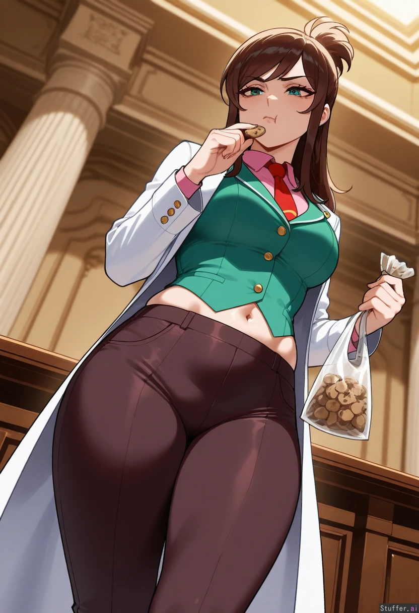 Masterpiece, best_quality, beautiful, vibrant colors, dim light, (1girl), alone, nyantcha(artist), Ema Skye, pink shirt, green vest with gold buttons, brown pants, capri pants, red tie, white coat, teal eyes, pouting, annoyed, eating chocolate chip, holding chips bag, courtroom, pudgy belly, midriff, burping, low angle, (overweight:0.5)