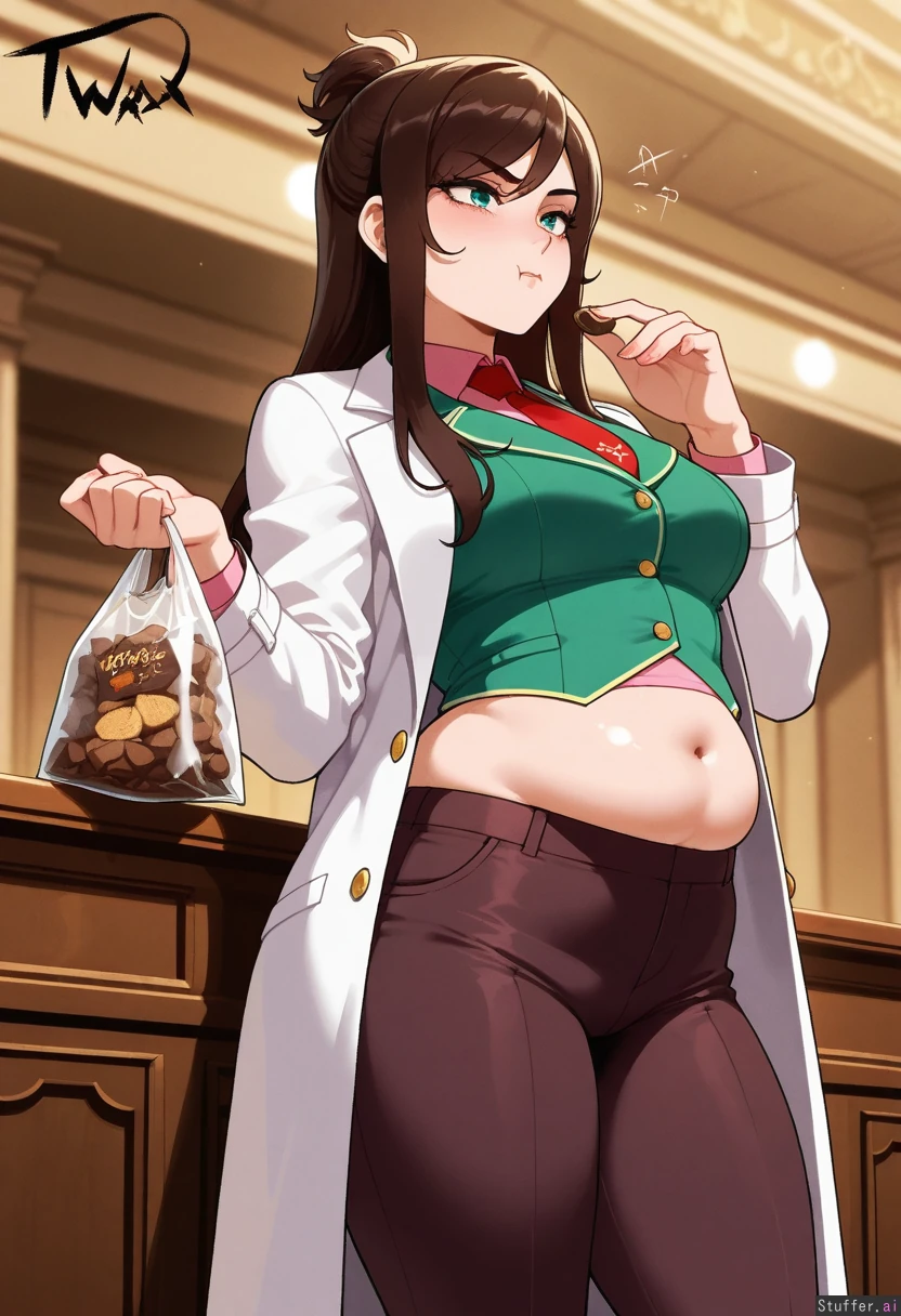 Masterpiece, best_quality, beautiful, vibrant colors, dim light, (1girl), alone, nyantcha(artist), Ema Skye, pink shirt, green vest with gold buttons, brown pants, capri pants, red tie, white coat, teal eyes, pouting, annoyed, eating chocolate, holding chips bag, courtroom, overflowing belly, midriff, burping, low angle, (overweight:0.5)