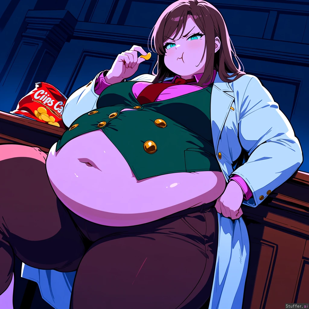Masterpiece, best_quality, beautiful, vibrant colors, dim light, (1girl), alone, Ema Skye, pink shirt, green vest with gold buttons, brown pants, capri pants, red tie, white coat, teal eyes, pouting, annoyed, eating chocolate, holding chips bag, courtroom, overflowing belly, midriff, burping, low angle, (overweight:1.3)