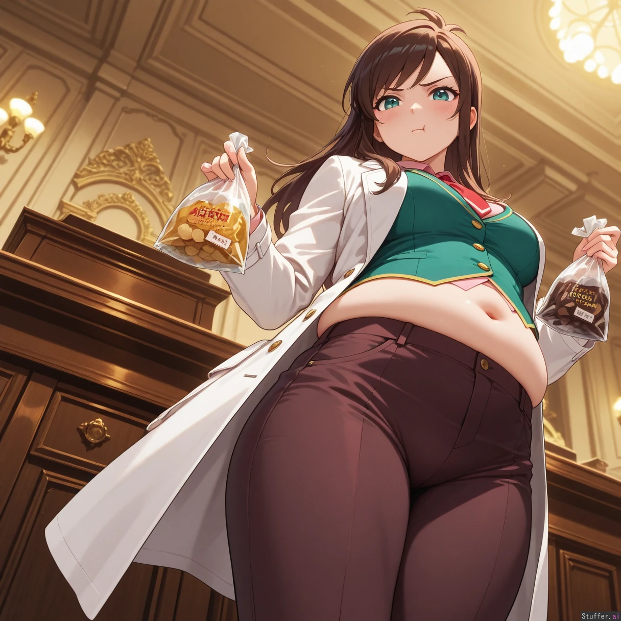 Masterpiece, best_quality, beautiful, vibrant colors, dim light, (1girl), alone, Ema Skye, pink shirt, green vest with gold buttons, brown pants, capri pants, red tie, white coat, teal eyes, pouting, annoyed, eating chocolate, holding chips bag, courtroom, overflowing belly, midriff, burping, low angle, (overweight:0.9)