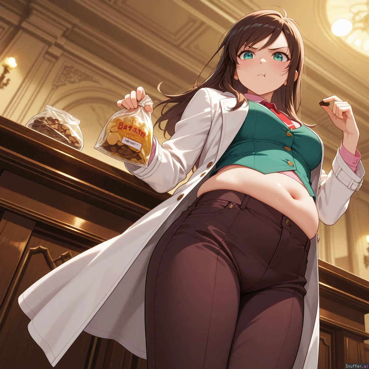 Masterpiece, best_quality, beautiful, vibrant colors, dim light, (1girl), alone, Ema Skye, pink shirt, green vest with gold buttons, brown pants, capri pants, red tie, white coat, teal eyes, pouting, annoyed, eating chocolate, holding chips bag, courtroom, overflowing belly, midriff, burping, low angle, (overweight:0.75)