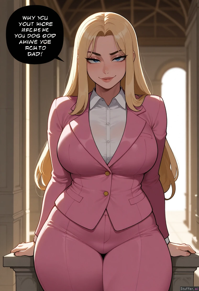 (masterpiece, amazing resolution , nyantcha(artist), krekkov (artist), KAMII MOMORU (artist), dramatic lighting, 8k, uhd) 1girl, garyu, long blond hair, blue eyes, annoyed, seductive, smirk, white button down, Pink suit, buttoned jacket, thick thighs, pink dress pants, day, bright, white stone pillars, park