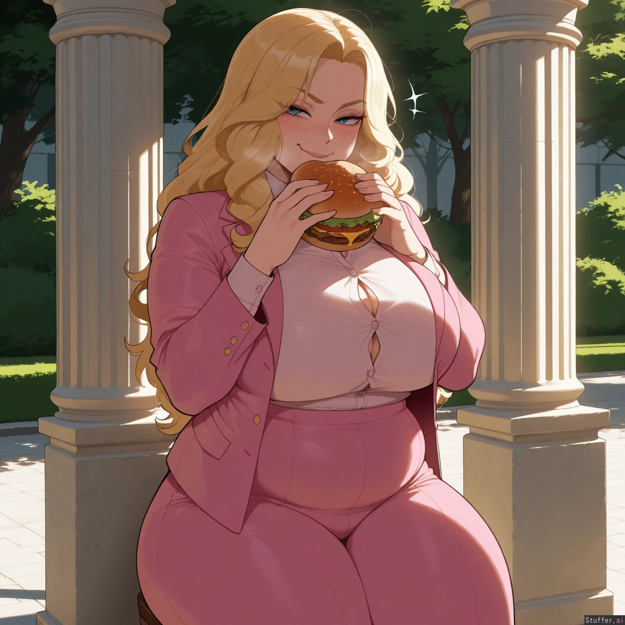 (masterpiece, amazing resolution , nyantcha(artist), krekkov (artist), KAMII MOMORU (artist), dramatic lighting, 8k, uhd) 1girl, garyu, long blond hair, blue eyes, annoyed, seductive, smirk, white button down, button gap, Pink suit, buttoned jacket, thick thighs, pink dress pants, eating a burger, happy, smiling, orgasmic, (overweight:1.2) day, bright, white stone pillars, park,