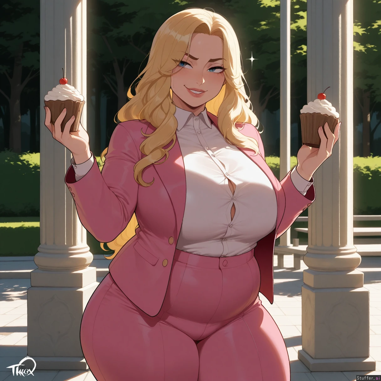 (masterpiece, amazing resolution , nyantcha(artist), krekkov (artist), KAMII MOMORU (artist), dramatic lighting, 8k, uhd) 1girl, garyu, long blond hair, blue eyes, annoyed, seductive, smirk, white button down, button gap, Pink suit, buttoned jacket, thick thighs, pink dress pants, eating cupcakes, happy, orgasmic, moaning (overweight:1.4) day, bright, white stone pillars, park,