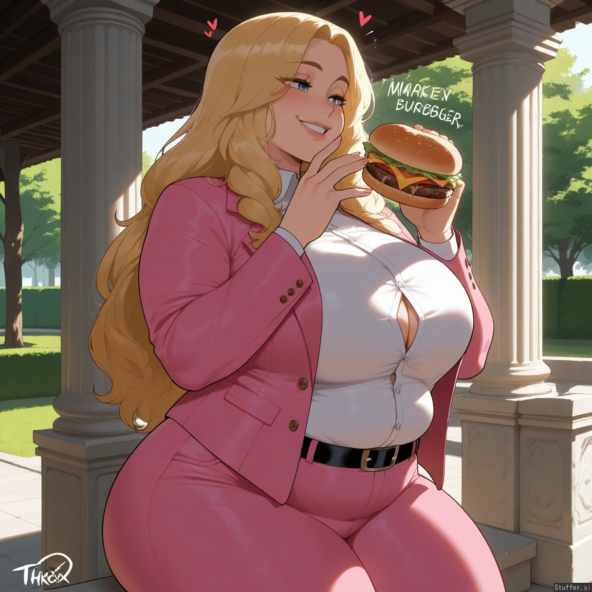 (masterpiece, amazing resolution , nyantcha(artist), krekkov (artist), KAMII MOMORU (artist), dramatic lighting, 8k, uhd) 1girl, garyu, long blond hair, blue eyes, chubby, seductive, smirk, white buttoned shirt, button gap, Pink suit, buttoned jacket, thick thighs, low-rise pink pants, black belt, eating burger, happy, orgasmic, moaning (overweight:1.8) day, bright, white stone pillars, park,