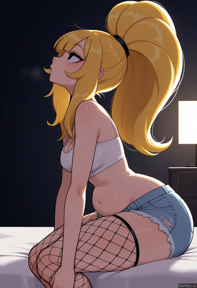 (narrow waist:1.2), Bedroom, legs together, Horny, merunyaa, usa37107692, nyantcha, limebreaker, krekkov, betterwithsalt, (distant warm ambient lighting) detailed lighting, 1girl, solo, (looking up), (Side view:1.3), sitting on bed, leaning forward, blonde_hair , huge ponytail , bangs, tons of hair, (narrow shoulders), slim arms, lose white crop top, fishnets , ripped jeans shorts, (belly roll:1.6), (pudgy_belly), medium_breasts , black eyes, (muffin_top:1.2) ,