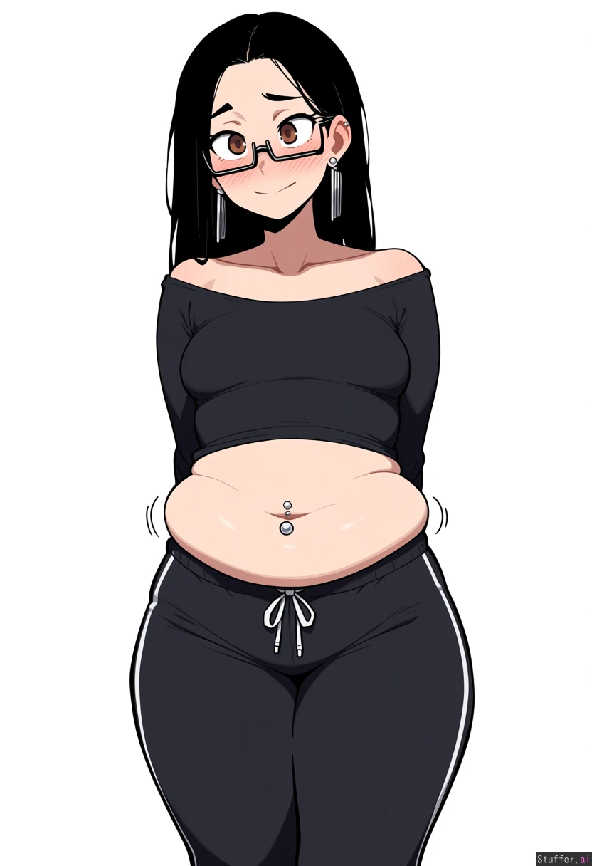 1girl, fair skin, rectangle glasses, black sweatpants, black fitted off-shoulder shirt, navel piercing, long black hair, silver earrings, brown eyes, big eyes, standing, small breasts, hands_behind_back, skinny arms, shy smile, blush, small hips, big eyes, cute, slim legs, ((weight_gain:1.3)), motion_lines, breast_expansion, belly_expansion, bellyheavy