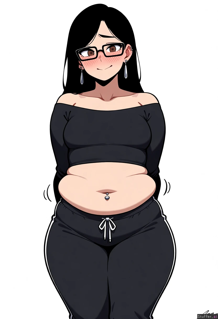 1girl, fair skin, rectangle glasses, black high-waist sweatpants, black fitted off-shoulder shirt, navel piercing, long black hair, silver earrings, brown eyes, big eyes, standing, hands_behind_back, skinny arms, shy smile, blush, big eyes, cute, slim legs, ((weight_gain:1.5)), motion_lines, breast_expansion, belly_expansion, bellyheavy